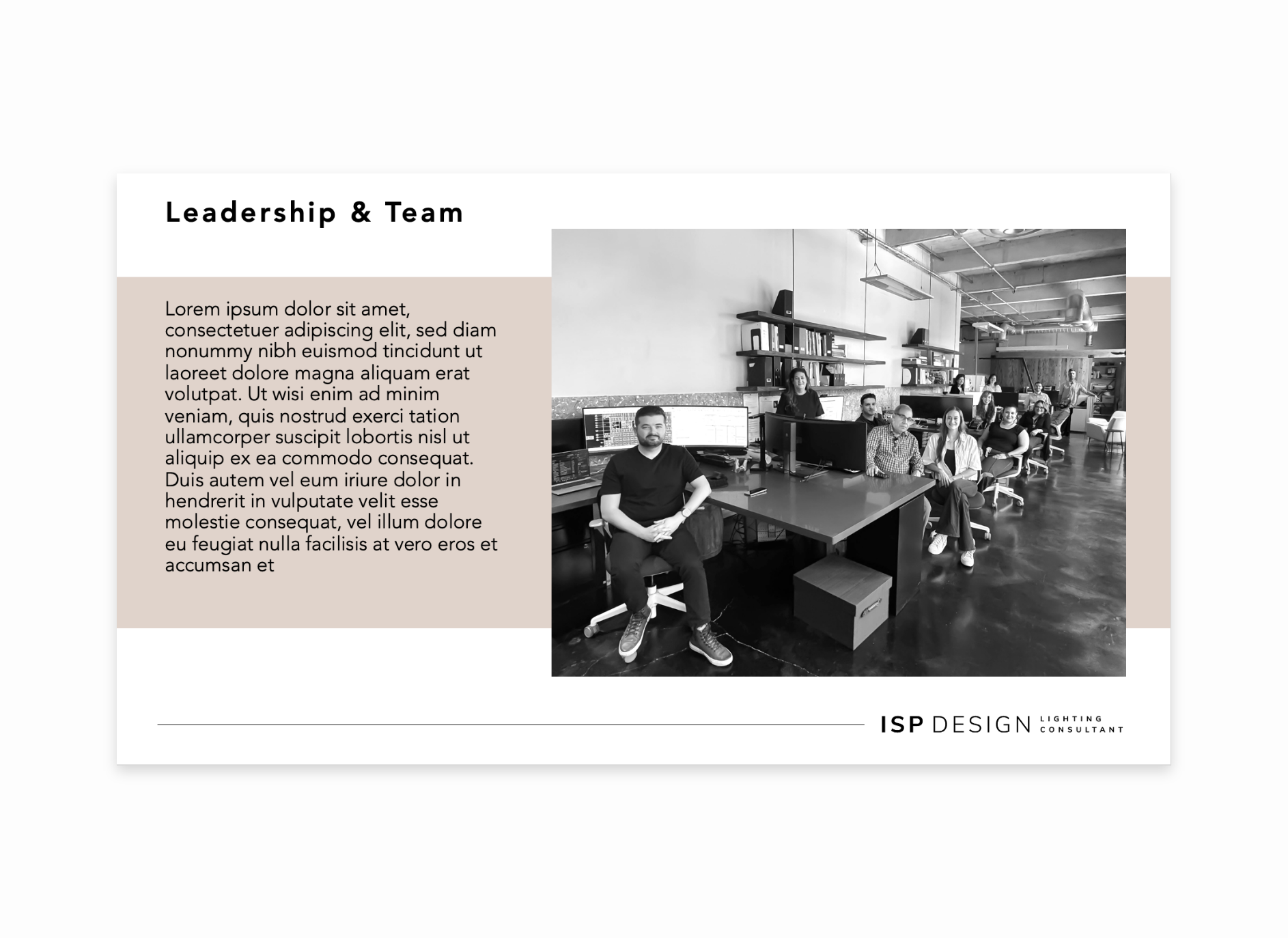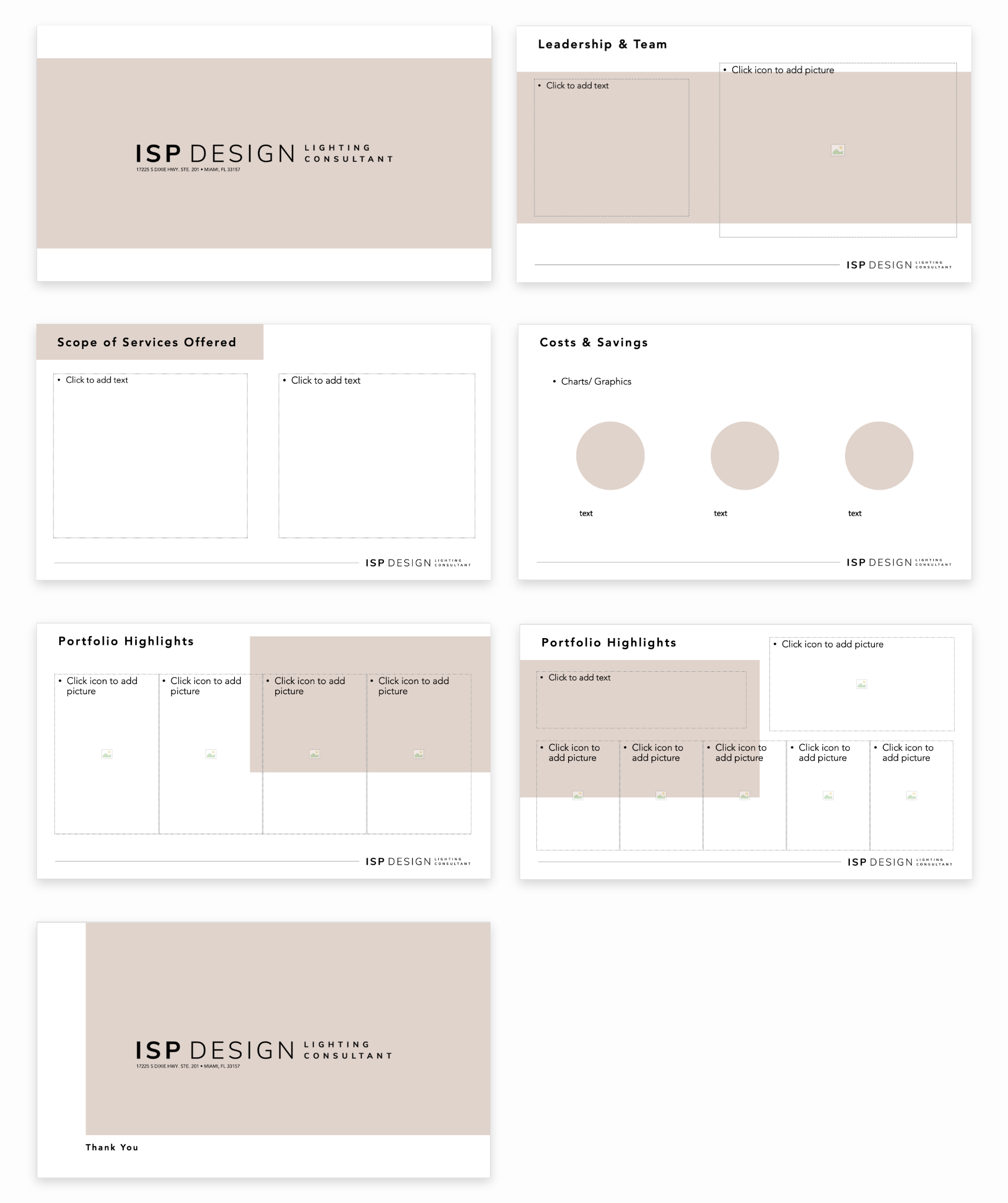 Custom presentation template designed for ISP Design, a South Florida-based lighting design company, featuring flexible layouts, consistent typography, and placeholder elements to ensure professional, on-brand presentations.